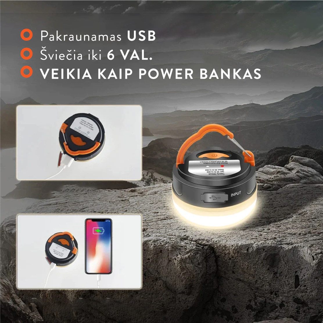 Įkraunamas USB + maitinimo blokas. Integruota 1800 mAh ličio jonų įkraunama baterija su USB įkrovimu, nereikia keisti baterijų. Daugiau nei 6 valandos Ilgalaikis apšvietimas. Stovyklavietės lemputė taip pat gali būti naudojama kaip maitinimo blokas telefono įkrovimui kritiniu atveju.
